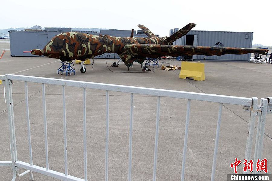 曾在前兩屆珠海航展上展出模型的翼龍無(wú)人機(jī),在今年航展上以實(shí)物參展。11月8日,該機(jī)已經(jīng)組裝完畢停放在展坪上。該款無(wú)人機(jī)由中航工業(yè)旗下成都飛機(jī)設(shè)計(jì)研究所研制,該機(jī)裝有一臺(tái)100馬力活塞發(fā)動(dòng)機(jī),具備全自主平輪式起降和飛行能力,最大起飛重量達(dá)1100公斤,最大續(xù)航時(shí)間為20個(gè)小時(shí),可攜帶各種偵察、激光照射/測(cè)距、電子對(duì)抗設(shè)備及小型空地打擊武器,可執(zhí)行監(jiān)視、偵查及對(duì)地攻擊任務(wù)等任務(wù),也可用于維穩(wěn)、反恐、邊界巡邏等。