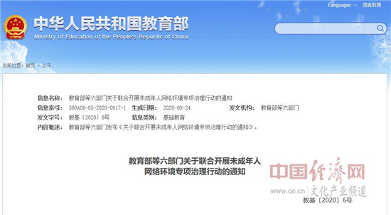 教育部等六部門關(guān)于聯(lián)合開展未成年人網(wǎng)絡(luò)環(huán)境專項(xiàng)治理行動(dòng)的通知