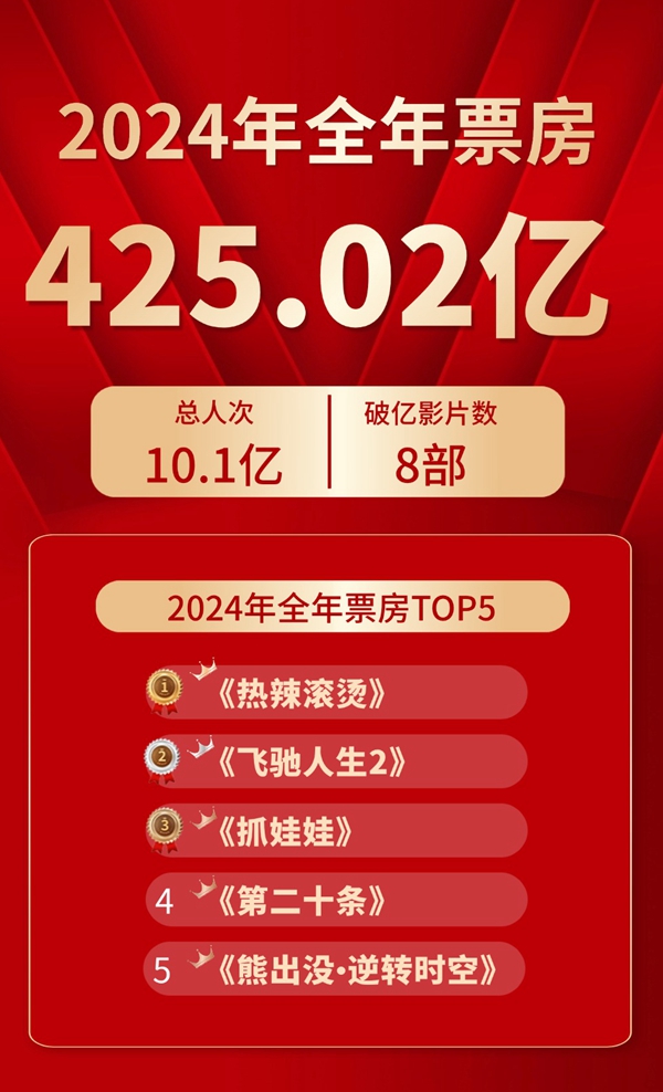 據(jù)貓眼專業(yè)版數(shù)據(jù),2024年全年共有8部影片破10億,年度票房冠軍為春節(jié)檔影片《熱辣滾燙》,全年大盤占比為8.1%。年度TOP10影片分別為《熱辣滾燙》《飛馳人生2》《抓娃娃》《第二十條》《熊出沒·逆轉(zhuǎn)時空》《默殺》《志愿軍:存亡之戰(zhàn)》《年會不能停!》《哥斯拉大戰(zhàn)金剛2:帝國崛起》《你想活出怎樣的人生》,其中,國產(chǎn)片占據(jù)八席,進(jìn)口片占據(jù)兩席,涵蓋類型包括喜劇、劇情、犯罪、戰(zhàn)爭、動作、動畫等。整體看來,2024年電影市場仍呈現(xiàn)出較強(qiáng)的韌性和上升空間。