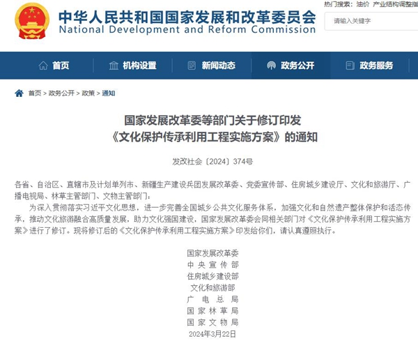 中國(guó)經(jīng)濟(jì)網(wǎng)北京4月8日訊(記者 成琪)據(jù)國(guó)家發(fā)改委網(wǎng)站4月7日消息,為進(jìn)一步完善全國(guó)城鄉(xiāng)公共文化服務(wù)體系,加強(qiáng)文化和自然遺產(chǎn)整體保護(hù)和活態(tài)傳承,推動(dòng)文化旅游融合高質(zhì)量發(fā)展,助力文化強(qiáng)國(guó)建設(shè),國(guó)家發(fā)展改革委會(huì)同相關(guān)部門(mén)對(duì)《文化保護(hù)傳承利用工程實(shí)施方案》(以下簡(jiǎn)稱(chēng)“《方案》”)進(jìn)行了修訂?!斗桨浮访鞔_,要依托國(guó)家級(jí)資源新建或改擴(kuò)建一批重大文化設(shè)施,提升公共文化服務(wù)水平,促進(jìn)優(yōu)秀傳統(tǒng)文化和寶貴自然遺產(chǎn)整體保護(hù)和活態(tài)傳承,推動(dòng)高質(zhì)量發(fā)展和創(chuàng)造高品質(zhì)生活相得益彰。