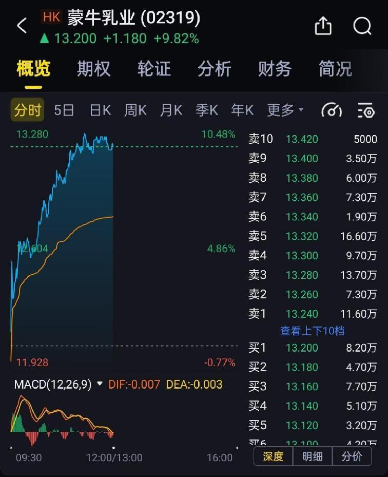早盤,蒙牛以11.92元小幅低開后一路高漲,截至中午收盤,蒙牛乳業(yè)報(bào)13.20元,上漲9.82%,成交4.64億元,成交量相較前一交易日顯著放大。