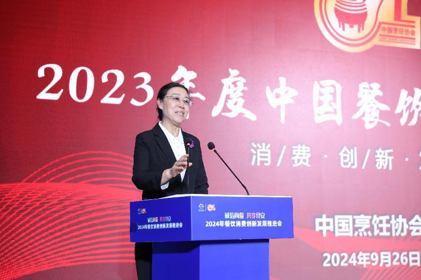 圖為呂秋菊特邀副會(huì)長(zhǎng)發(fā)布《中國(guó)餐飲企業(yè)發(fā)展形勢(shì)分析》