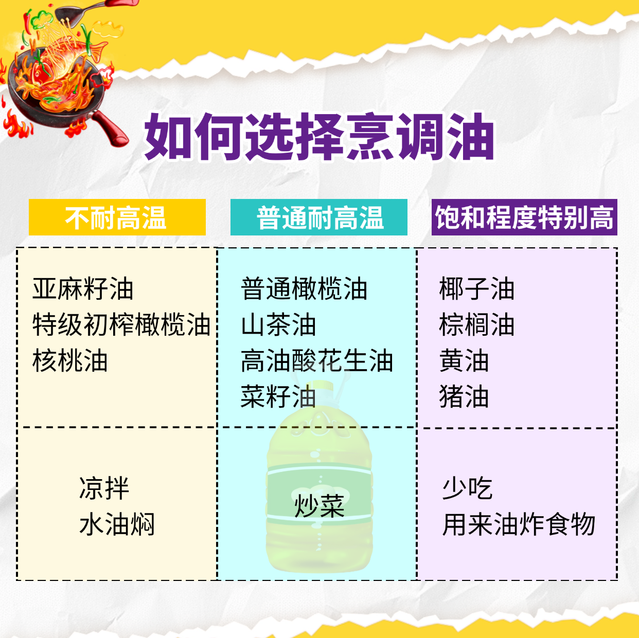 市面上的烹調(diào)油多種多樣,該如何選擇?曹展表示,不耐高溫的烹調(diào)油,如亞麻籽油、特級(jí)初榨橄欖油、核桃油等,可以用來涼拌、水油燜;普通耐高溫的烹調(diào)油,如普通橄欖油、山茶油、高油酸花生油、菜籽油等,可以用來炒菜;飽和程度特別高的烹調(diào)油,如椰子油、棕櫚油、黃油、豬油等,首先要少吃,如果有需要,可以偶爾用來油炸食物。