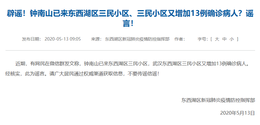 據(jù)武漢市東西湖區(qū)人民政府官網(wǎng)5月13日消息,經(jīng)核實,網(wǎng)傳“鐘南山已來東西湖區(qū)三民小區(qū),武漢東西湖區(qū)三民小區(qū)又增加13例確診病人?!?“長青街三民小區(qū)居民健康碼全部轉(zhuǎn)紅碼、三民小區(qū)門口全是特警守門”均系謠言。