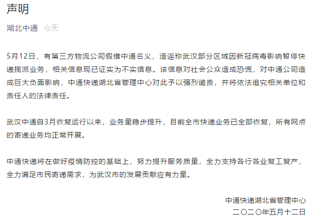 5月12日,湖北中通吉物流有限公司官微“湖北中通”發(fā)布聲明稱,5月12日,有第三方物流公司假借中通名義,造謠稱武漢部分區(qū)域因新冠病毒影響暫??爝f攬派業(yè)務(wù),相關(guān)信息現(xiàn)已證實為不實信息。武漢中通自3月恢復(fù)運行以來,業(yè)務(wù)量穩(wěn)步提升,目前全市快遞業(yè)務(wù)已全部恢復(fù),所有網(wǎng)點的寄遞業(yè)務(wù)均正常開展。