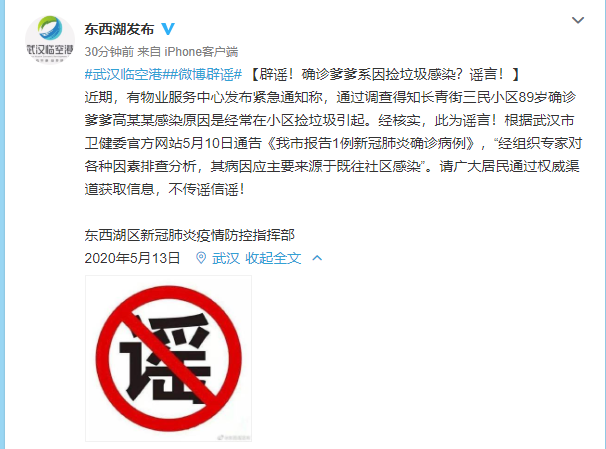 據(jù)武漢市東西湖區(qū)人民政府官方微博5月13日消息,近期,有物業(yè)服務(wù)中心發(fā)布緊急通知稱,通過調(diào)查得知武漢市東西湖區(qū)長青街三民小區(qū)89歲確診爹爹高某某感染原因是經(jīng)常在小區(qū)撿垃圾引起。經(jīng)核實,此為謠言。根據(jù)武漢市衛(wèi)健委官方網(wǎng)站5月10日通告《我市報告1例新冠肺炎確診病例》,“經(jīng)組織專家對各種因素排查分析,其病因應(yīng)主要來源于既往社區(qū)感染”。請廣大居民通過權(quán)威渠道獲取信息,不傳謠信謠!
