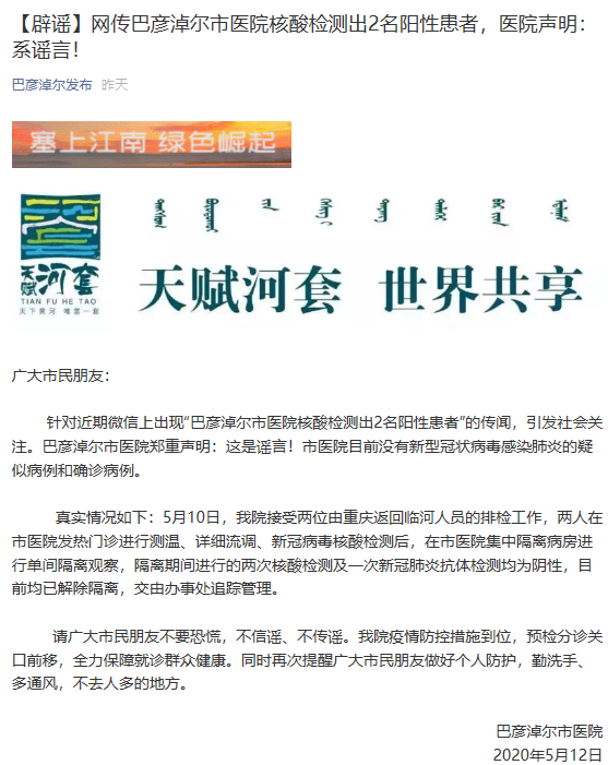 謠言粉碎機五:內(nèi)蒙古巴彥淖爾市醫(yī)院核酸檢測出2名陽性患者?謠言!