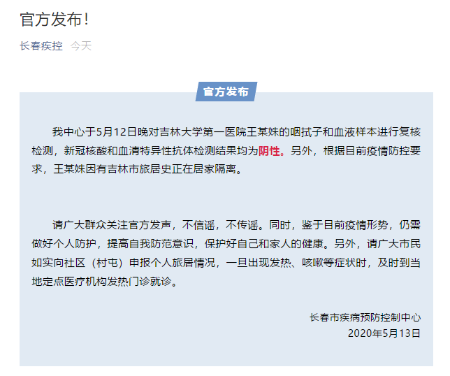 近日,有網(wǎng)傳稱吉林大學(xué)第一醫(yī)院出現(xiàn)新冠病例。5月13日,長春市疾病預(yù)防控制中心官微對此回應(yīng)稱,長春市疾病預(yù)防控制中心于5月12日晚對吉林大學(xué)第一醫(yī)院王某姝的咽拭子和血液樣本進行復(fù)核檢測,新冠核酸和血清特異性抗體檢測結(jié)果均為陰性。另外,根據(jù)目前疫情防控要求,王某姝因有吉林市旅居史正在居家隔離。請廣大群眾關(guān)注官方發(fā)聲,不信謠,不傳謠。