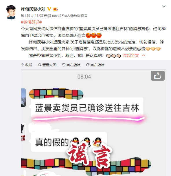 據(jù)吉林省樺甸市公安局永吉派出所民警劉剛 @樺甸民警小劉 5月19日消息,經向樺甸市衛(wèi)健部門核實,網(wǎng)傳“藍景賣貨員已確診送往吉林”系謠言。