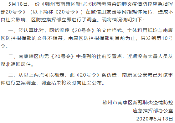 據(jù)中共贛州市南康區(qū)委宣傳部官微“南康發(fā)布”5月19日消息,贛州市南康區(qū)新冠肺炎疫情防控應(yīng)急指揮部辦公室稱,5月18日,一份《贛州市南康區(qū)新型冠狀病毒感染的肺炎疫情防控應(yīng)急指揮部20號(hào)令》(以下簡稱《20號(hào)令》)在微信朋友圈等網(wǎng)絡(luò)媒體流傳,造成不良社會(huì)影響,南康區(qū)防控指揮部立即進(jìn)行了調(diào)查。現(xiàn)將情況說明如下: