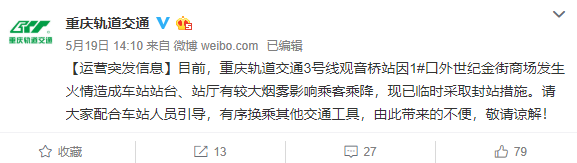 近日,有消息稱因出現(xiàn)疑似病例,重慶軌道交通3號(hào)線觀音橋站被封。對此,5月19日14時(shí),重慶市軌道交通(集團(tuán))有限公司@重慶軌道交通回應(yīng)稱,目前,重慶軌道交通3號(hào)線觀音橋站因1#口外世紀(jì)金街商場發(fā)生火情造成車站站臺(tái)、站廳有較大煙霧影響乘客乘降,現(xiàn)已臨時(shí)采取封站措施。????