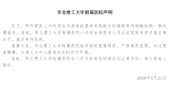 5月21日,華北理工大學(xué)附屬醫(yī)院發(fā)布聲明稱,近日,網(wǎng)傳“煤醫(yī)(現(xiàn)為華北理工大學(xué)附屬醫(yī)院)心內(nèi)科因哈爾濱來的患者發(fā)燒致全科隔離等待核酸檢測”一事純屬謠傳。目前,華北理工大學(xué)附屬醫(yī)院心內(nèi)科全體醫(yī)務(wù)人員正在緊張有序開展正常診療,就診秩序良好。