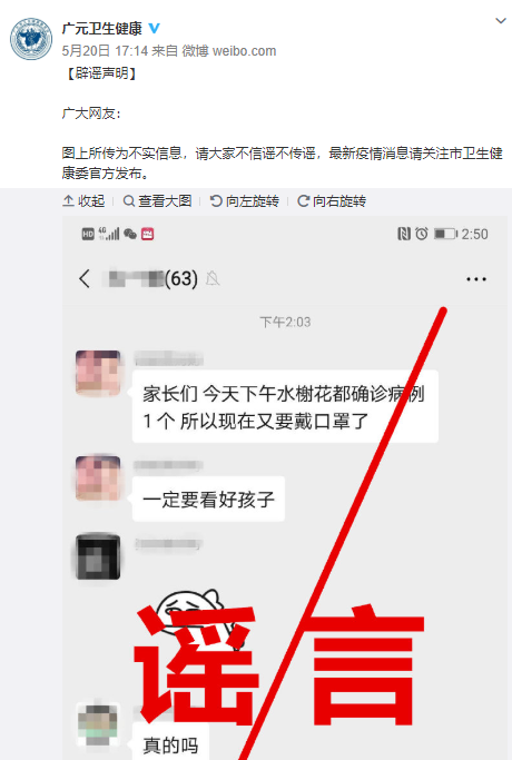 5月20日,四川省廣元市衛(wèi)生健康委員會(huì)官方微博@廣元衛(wèi)生健康發(fā)布辟謠聲明稱,網(wǎng)傳“廣元市水榭花都小區(qū)確診一新冠肺炎病例”為謠言。