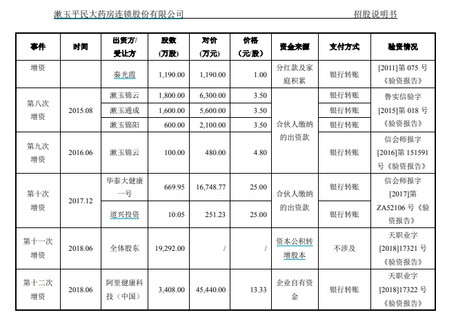 “V觀財(cái)報(bào)”查閱漱玉平民招股書發(fā)現(xiàn),2018年6月,漱玉平民股東大會通過決議,同意將注冊資本增加至36480萬元。新增的注冊資本3408萬元由阿里健康以45440萬元認(rèn)繳,全部為貨幣出資。本次增資的價(jià)格為13.33元/股。
