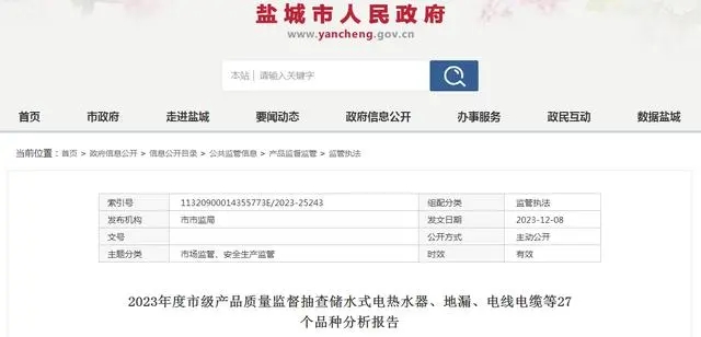 2023年度江蘇省鹽城市儲水式電熱水器產(chǎn)品質量監(jiān)督抽查分析報告