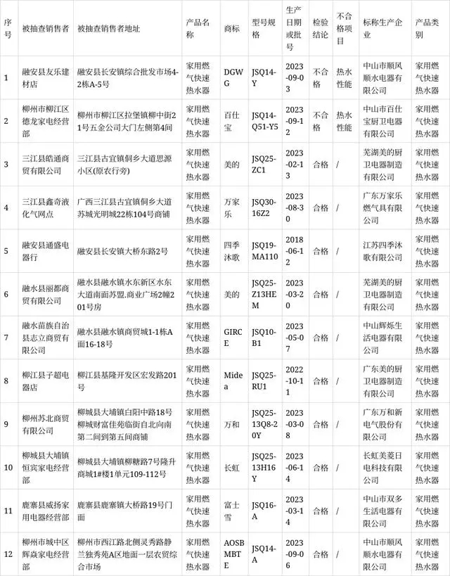 其中,2023年共抽查12家銷(xiāo)售者的12批次家用燃?xì)饪焖贌崴鳟a(chǎn)品,檢驗(yàn)結(jié)果不合格2批次,不合格檢出率為16.67%。重點(diǎn)對(duì)產(chǎn)品的安全裝置結(jié)構(gòu)要求、燃?xì)庀到y(tǒng)氣密性、燃燒工況、熱水性能、表面溫升、銘牌等6個(gè)項(xiàng)目進(jìn)行檢驗(yàn),不合格項(xiàng)目涉及熱水性能。