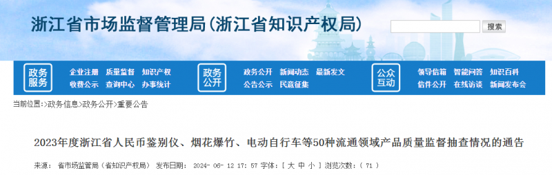 2024年6月12日,浙江省市場監(jiān)督管理局網站發(fā)布2023年度浙江省人民幣鑒別儀、煙花爆竹、電風扇、電動自行車等50種流通領域產品質量監(jiān)督抽查情況的通告。