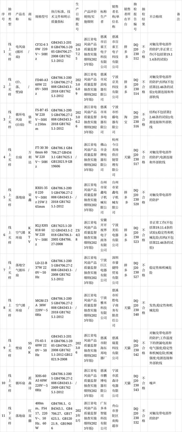 本次抽查了40批次電風扇產品,其中11批次產品不合格。不合格項目為對觸及帶電部件的防護、非正常工作、結構、電源連接和外部軟線、發(fā)熱、穩(wěn)定性和機械危險、工作溫度下的泄漏電流和電氣強度、機械強度、噪聲。