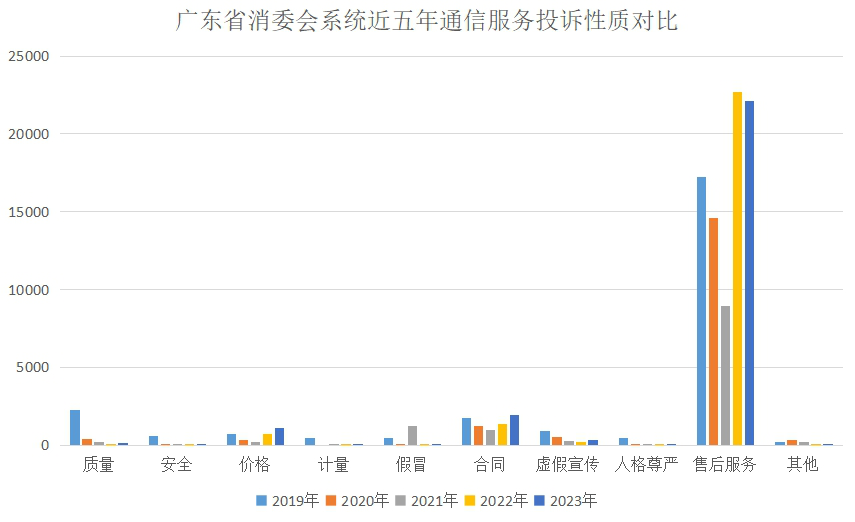 從投訴類別來(lái)看,近5年通信服務(wù)投訴95%以上集中在移動(dòng)電話服務(wù),與當(dāng)前通信業(yè)發(fā)展現(xiàn)狀相符(2023年廣東固話、移動(dòng)電話用戶數(shù)比例約為1:10)。從投訴性質(zhì)來(lái)看,消費(fèi)者反映的問(wèn)題主要集中在售后服務(wù)、合同和價(jià)格3類,其中售后服務(wù)問(wèn)題最為集中,占投訴總量的80.19%,是通信服務(wù)類投訴增長(zhǎng)變化的主要因素。從地區(qū)分布來(lái)看,通信服務(wù)投訴集中在消費(fèi)活躍的珠三角地區(qū),主要與經(jīng)濟(jì)發(fā)展?fàn)顩r、人員密集程度相關(guān)。