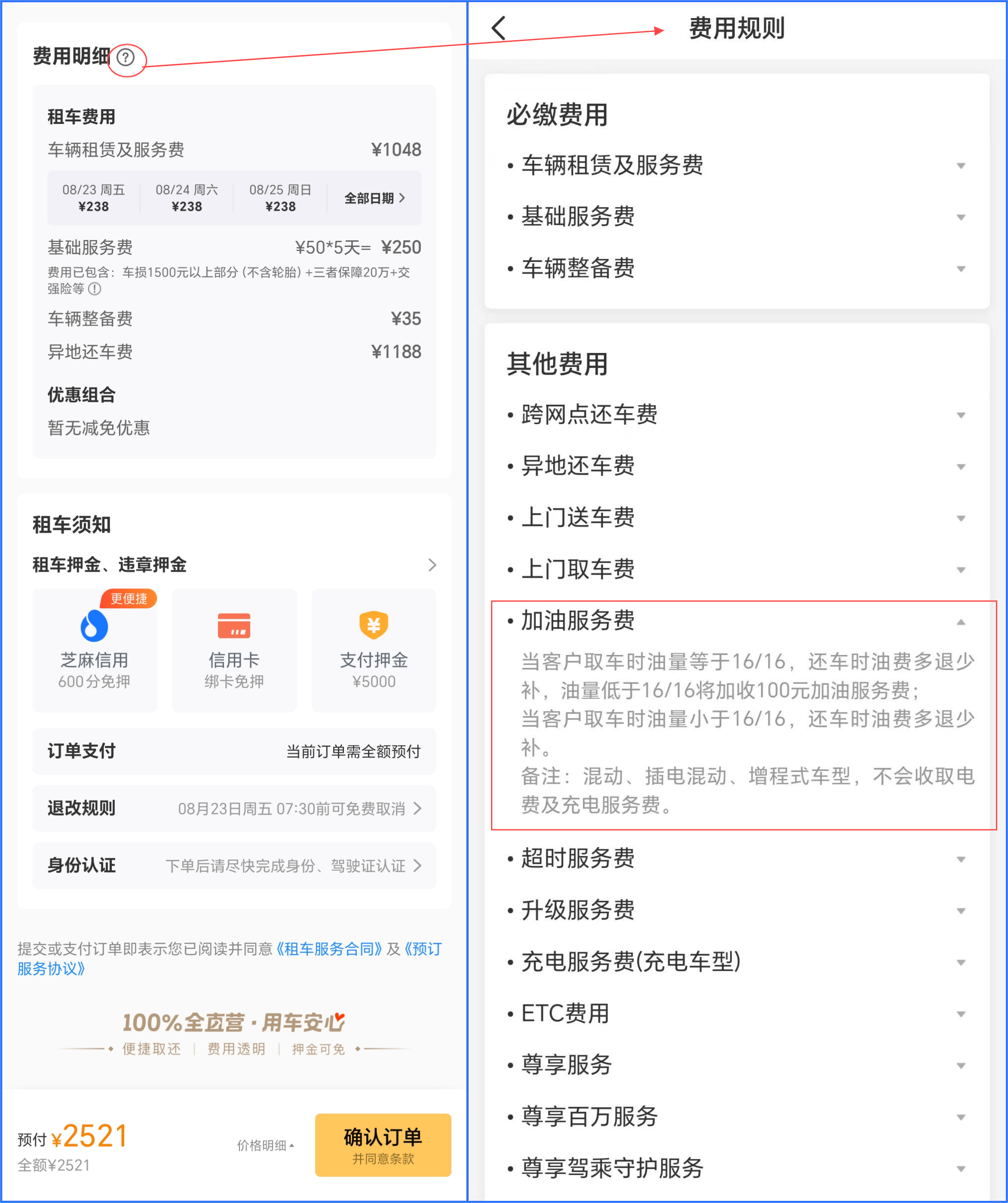 《中國(guó)消費(fèi)者報(bào)》在神州租車(chē)APP上下單租車(chē),經(jīng)過(guò)仔細(xì)找尋,發(fā)現(xiàn)必須點(diǎn)開(kāi)“費(fèi)用明細(xì)”旁邊一個(gè)不起眼的圓圈小問(wèn)號(hào)圖標(biāo)后,才會(huì)跳轉(zhuǎn)至標(biāo)注著“費(fèi)用規(guī)則”的清單。在“其他費(fèi)用”一欄中包括了“加油服務(wù)費(fèi)”,點(diǎn)開(kāi)后灰色小字顯示“當(dāng)客戶取車(chē)時(shí)油量等于16/16,還車(chē)時(shí)油費(fèi)多退少補(bǔ),油量低于16/16將加收100元加油服務(wù)費(fèi)”。