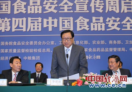 6月11日至17日被確定為今年的全國食品安全宣傳周。宣傳周主題為“共建誠信家園 同鑄食品安全”。全國食品安全宣傳周啟動(dòng)儀式由國務(wù)院食品安全委員會(huì)辦公室、工業(yè)和信息化部、農(nóng)業(yè)部、商務(wù)部、衛(wèi)生部、國家工商總局、國家質(zhì)檢總局、國家糧食局、國家食品藥品監(jiān)管局、中國科協(xié)共同主辦,經(jīng)濟(jì)日?qǐng)?bào)社、中糧集團(tuán)承辦,中國經(jīng)濟(jì)網(wǎng)執(zhí)行承辦。圖為全國人大常委會(huì)副委員長華建敏宣布全國食品安全宣傳周啟動(dòng) 裴小閣攝
