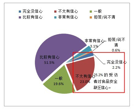 雖然,今年市民對食品安全比較有信心,但是食品安全問題現(xiàn)狀仍不可忽視,其中25.2%的市民對食品安全缺乏信心,51.5%的市民比較有信心,僅3.1%的市民非常有信心。