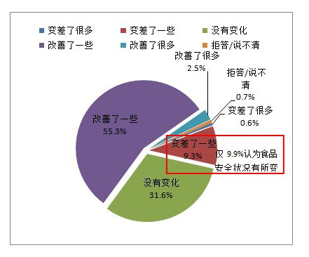 過去一年,國家多個部門發(fā)布了食品行業(yè)的新政策與新法規(guī),對食品工業(yè)行業(yè)嚴(yán)加把關(guān),多數(shù)市民也認(rèn)為食品安全狀況得到了改善。55.3%的市民認(rèn)為食品安全狀況改善了一些,2.5%的市民認(rèn)為食品安全狀況改善了很多,而在2011年只有35.4%的受訪者認(rèn)為食品安全狀況在過去一年有所改變,2012年比2011年提升19.9%。