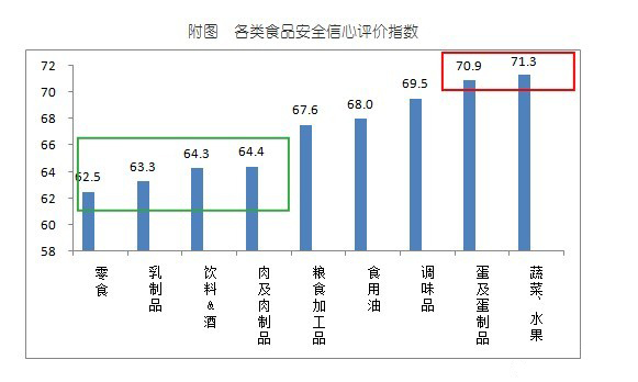各類食品中,市民對蔬菜水果、蛋及蛋制品的安全最有信心,分別高達(dá)71.3和70.9;而對零食、乳制品、飲料&酒和肉及肉制品的食品安全評價較低,全部低于65。而在2011年,消費(fèi)者對食品安全的評價中,肉及肉制品、乳制品的信心評價也較低。