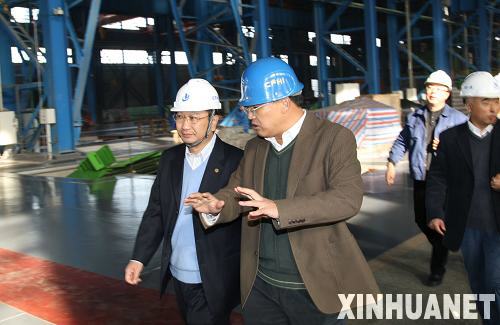 在一重新建成的重型加工熱處理車間,吳生富(戴藍(lán)帽者)向來(lái)訪的中廣核工程公司總經(jīng)理束國(guó)剛一行介紹一重在制核電產(chǎn)品情況(2009年10月28日攝)。新華社發(fā)(陳建軍攝)