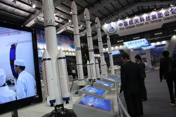 即將于2014年實現(xiàn)首飛的新一代大運(yùn)載火箭“長征五號”模型高高地矗立著。“長二F”、“長三甲”、“長四乙”等白色箭體模型緊隨其后,一字排開,場面蔚為壯觀。很多電視媒體在采訪時,都有意識地將長征火箭或者“天宮一號”的模型作為背景。