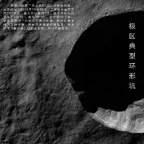 北京,2010年11月8日 國家國防科技工業(yè)局首次發(fā)布嫦娥二號月面虹灣局部影像圖 這是極區(qū)典型環(huán)形坑(成像時(shí)間為10月25日)。